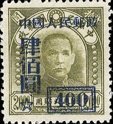 Visibility: public Image owner: none postage 7/1/1950 $400 issue=1950 provisional 2nd d=Sun Yatsen (1946 b) oc=blk on=issuer=Northeastern Provinces-issue=1946c-$20 Crops No visible images cropped from this one. Measurements Resolution is unknown. Source Source name: Colnect File URL: http://i.colnect.net/b/774/690/Dr-Sun-Yat-sen-overprints.jpg Uploaded August 18, 2014, 9:55 pm by Stan Shebs |