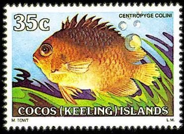 Visibility: public Image owner: none postage 35c multi issue=1979 dt=fishes (1979 Cocos (Keeling) Islands) d=Centropyge colini Crops No visible images cropped from this one. Measurements Resolution is unknown. Source Source name: Colnect File URL: http://i.colnect.net/images/b/1103/426/Colin--s-Angelfish-Centropyge-colini.jpg Uploaded August 18, 2014, 10:25 pm by Stan Shebs |