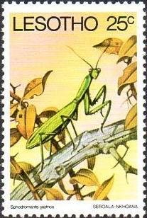 Visibility: public Image owner: none postage 12/18/1978 25c multi dt=insects (1978 Lesotho) d=Sphodromantis gastrica wmk=basuto hat perf=14 Crops No visible images cropped from this one. Measurements Resolution is unknown. Source Source name: Colnect File URL: http://i.colnect.net/b/1730/142/Common-Green-Mantis-Sphodromantis-gastrica.jpg Uploaded September 17, 2014, 6:02 pm by Stan Shebs |