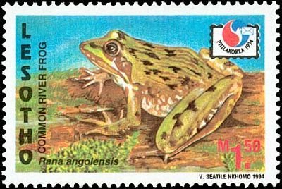 Visibility: public Image owner: none postage 8/16/1994 1.50m multi issue=PHILAKOREA '94 dt=frogs (1994) d=Rana angolensis wmk=basuto hat perf=14.25 Crops No visible images cropped from this one. Measurements Resolution is unknown. Source Source name: Colnect File URL: http://i.colnect.net/b/1735/682/Common-River-Frog-Rana-angolensis.jpg Uploaded September 17, 2014, 6:19 pm by Stan Shebs |