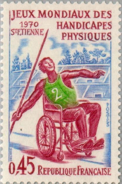 Visibility: public Image owner: none postage 6/27/1970 45c rosecar&ultra&emer issue=International Games of the Handicapped d=javelin thrower in wheelchair unwmk perf=13 Crops No visible images cropped from this one. Measurements Resolution is unknown. Source Source name: Colnect (old) File URL: http://i.colnect.net/b/144/720/Saint-Etienne-World-Games-for-the-physically-handicapped.jpg Uploaded September 29, 2012, 10:36 pm by Stan Shebs |