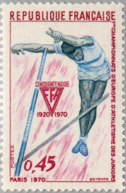 Visibility: public Image owner: none postage 9/11/1970 45c multi issue=European Junior Athletic Championships 1970 d=pole vaulter 1970 unwmk perf=13 Crops No visible images cropped from this one. Measurements Resolution is unknown. Source Source name: Colnect File URL: http://i.colnect.net/b/144/721/1st-European-Championships-in-Athletics-in-Paris-Junior.jpg Uploaded August 19, 2014, 3:53 pm by Stan Shebs |