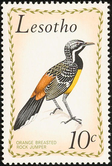 Visibility: public Image owner: none postage 3/1/1971 10c multi dt=birds (1971 Lesotho) d=orange breasted rock jumper wmk=basuto hat perf=14.25 Crops No visible images cropped from this one. Measurements Resolution is unknown. Source Source name: Colnect File URL: http://i.colnect.net/images/b/745/218/Drakensberg-Rockjumper-Chaetops-aurantius.jpg Uploaded August 20, 2014, 7:40 pm by Stan Shebs |