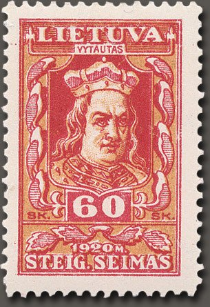 Visibility: public Image owner: none postage 8/25/1920 60sk red&org issue=assembly opening d=Vytautas (1920) wmk=zigzag lines forming rectangles perf=11.25 paper=thin white Crops No visible images cropped from this one. Measurements Resolution is unknown. Source Source name: Colnect File URL: http://i.colnect.net/b/447/634/Grand-Duke-Vytautas.jpg Uploaded August 20, 2014, 8:36 pm by Stan Shebs |