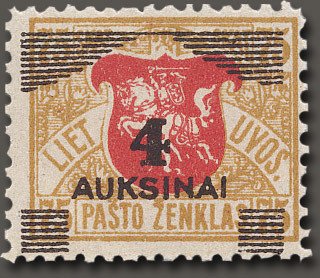 Visibility: public Image owner: none postage 5/1922 4auk bis&red d=white knight oc=blk on=5/8/1919-75sk wmk=wavy lines (Lithuania) paper=thin white Crops No visible images cropped from this one. Measurements Resolution is unknown. Source Source name: Colnect File URL: http://i.colnect.net/b/448/713/Coat-of-arms-with-an-overlay-value.jpg Uploaded August 20, 2014, 8:36 pm by Stan Shebs |