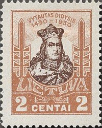 Visibility: public Image owner: none postage 2/16/1930 2c brn&sep issue=Vytautas death 500th d=Vytautas Didysis (1930) wmk=webbing perf=14 Crops No visible images cropped from this one. Measurements Resolution is unknown. Source Source name: Colnect File URL: http://i.colnect.net/b/474/615/Vytautas-1350-1430.jpg Uploaded August 20, 2014, 8:54 pm by Stan Shebs |