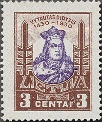Visibility: public Image owner: none postage 2/16/1930 3c dkbrn&vio issue=Vytautas death 500th d=Vytautas Didysis (1930) wmk=webbing perf=14 Crops No visible images cropped from this one. Measurements Resolution is unknown. Source Source name: Colnect File URL: http://i.colnect.net/b/474/616/Vytautas-1350-1430.jpg Uploaded August 20, 2014, 8:54 pm by Stan Shebs |