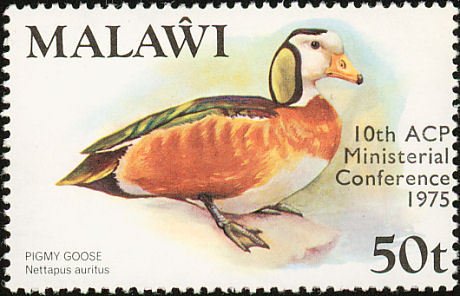 Visibility: public Image owner: none postage 12/9/1975 50t multi dt=birds (1975 Malawi) d=Nettapus auritus (1975) ovpt=10th ACP//... oc=blk on=2/19/1975-50t wmk=mult cockerel Crops No visible images cropped from this one. Measurements Resolution is unknown. Source Source name: Colnect File URL: http://i.colnect.net/b/864/260/African-Pygmy-Goose-Nettapus-auritus.jpg Uploaded August 20, 2014, 10:15 pm by Stan Shebs |