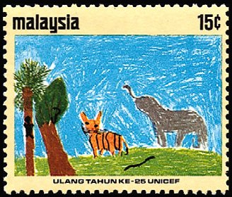 Visibility: public Image owner: none postage 10/2/1971 15c yel&multi issue=UNICEF 25th dt=children's drawings (1971 Malaysia) d=Childrens drawing Tiger & elephant unwmk perf=12.75 Crops No visible images cropped from this one. Measurements Resolution is unknown. Source Source name: Colnect File URL: http://i.colnect.net/b/982/220/Children-s-drawing-Tiger-and-elephant.jpg Uploaded August 20, 2014, 10:18 pm by Stan Shebs |