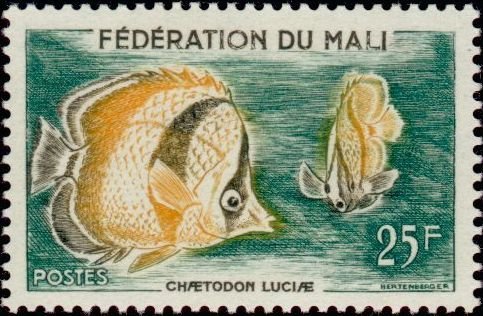 Visibility: public Image owner: none postage 3/5/1960 25fr dt=fishes (1960 Mali Federation) d=Chaetodon luciae unwmk Crops No visible images cropped from this one. Measurements Resolution is unknown. Source Source name: Colnect File URL: http://i.colnect.net/b/1049/707/Three-banded-Butterflyfish-Chaetodon-luciae.jpg Uploaded August 20, 2014, 11:20 pm by Stan Shebs |