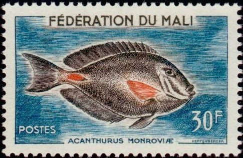 Visibility: public Image owner: none postage 3/5/1960 30fr dt=fishes (1960 Mali Federation) d=Acanthurus monroviae unwmk Crops No visible images cropped from this one. Measurements Resolution is unknown. Source Source name: Colnect File URL: http://i.colnect.net/b/1049/708/Monrovia-Surgeonfish-Acanthurus-monroviae.jpg Uploaded August 20, 2014, 11:20 pm by Stan Shebs |