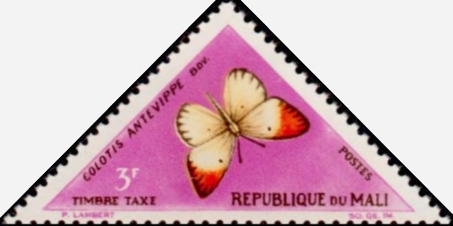 Visibility: public Image owner: none postage due 6/1/1964 3fr multi issue=1964 due dt=butterflies (1964 Mali) d=Colotis antevippe (1964) unwmk perf=11 Crops No visible images cropped from this one. Measurements Resolution is unknown. Source Source name: Colnect File URL: http://i.colnect.net/b/797/093/Red-Tip-Colotis-antevippe.jpg Uploaded August 20, 2014, 11:22 pm by Stan Shebs |