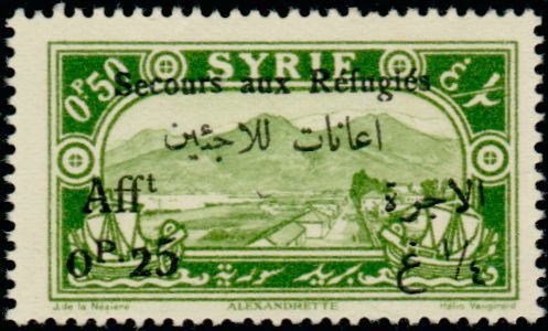 Visibility: public Image owner: none semipostal 50c+25c yelgrn issue=Relief for refugees from Jebel Druze war dt=landmarks (1925) d=view of Alexandretta ovpt=Secours aux Refugies//(arabic)//... oc=blk on=3/1925-50c unwmk Crops No visible images cropped from this one. Measurements Resolution is unknown. Source Source name: Colnect File URL: http://i.colnect.net/images/b/883/781/-quot-Secours-aux-Refugi-eacute-s-quot---amp--value-on-Definitive-1925.jpg Uploaded August 21, 2014, 3:52 pm by Stan Shebs |