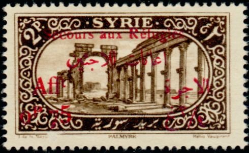 Visibility: public Image owner: none semipostal 2p+75c dkbrn issue=Relief for refugees from Jebel Druze war dt=landmarks (1925) d=ruins at Palmyra ovpt=Secours aux Refugies//(arabic)//... oc=red on=3/1925-2p unwmk Crops No visible images cropped from this one. Measurements Resolution is unknown. Source Source name: Colnect File URL: http://i.colnect.net/images/b/883/786/-quot-Secours-aux-Refugi-eacute-s-quot---amp--value-on-Definitive-1925.jpg Uploaded August 21, 2014, 3:52 pm by Stan Shebs |