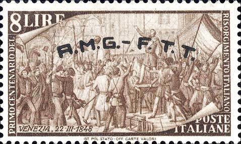 Visibility: public Image owner: none postage 7/1/1948 8l brn issue=1948 b ovpt=A.M.G.-F.T.T. oc=blk on=issuer=Italy-issue=Risorgimento 100th-8l wmk=winged wheel perf=14 Crops No visible images cropped from this one. Measurements Resolution is unknown. Source Source name: Colnect File URL: http://i.colnect.net/b/1391/375/Centenary-of-the-revival.jpg Uploaded September 17, 2014, 7:00 pm by Stan Shebs |