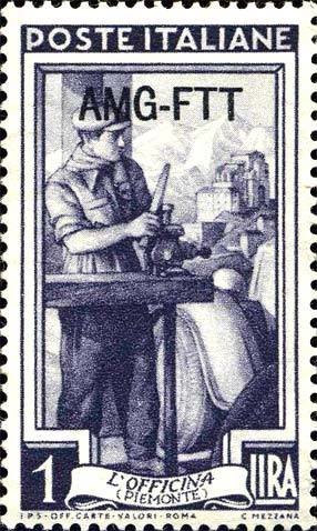 Visibility: public Image owner: none postage 10/20/1950 1l dkblvio issue=occupations dt=occupations (1950) d=l'officina (Piemonte) ovpt=A.M.G. F.T.T.//posthorn 1948//TRIESTE oc=blk on=issuer=Italy-1l-dt=occupations wmk=winged wheel perf=14 Crops No visible images cropped from this one. Measurements Resolution is unknown. Source Source name: Colnect File URL: http://i.colnect.net/b/1424/570/Italy-at-work.jpg Uploaded September 17, 2014, 7:02 pm by Stan Shebs |