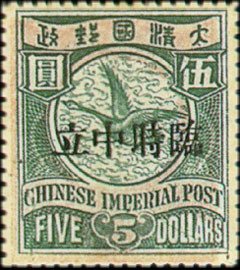 Visibility: public Image owner: none postage 1/30/1912 $5 dpgrn&sal issue=Foochow neutrality dt=Chinese Imperial Post d=wild goose (1898) ovpt=Foochow oc=blk on=issue=1900-$5-dpgrn&sal unwmk Crops No visible images cropped from this one. Measurements Resolution is unknown. Source Source name: Colnect File URL: http://i.colnect.net/b/1808/363/Provisional-Neutrality-Overprinted.jpg Uploaded September 17, 2014, 7:11 pm by Stan Shebs |