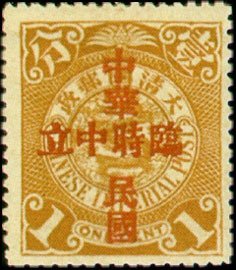 Visibility: public Image owner: none postage 3/20/1912 1c och issue=Nanking neutrality dt=Chinese Imperial Post d=dragon (1898) ovpt=Nanking oc=blk on=issue=1900-1c-och unwmk Crops No visible images cropped from this one. Measurements Resolution is unknown. Source Source name: Colnect File URL: http://i.colnect.net/b/1808/373/Coiling-Dragon-Republic-of-China-and-Provisional-Neutrality.jpg Uploaded September 17, 2014, 7:11 pm by Stan Shebs |