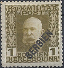 Visibility: public Image owner: none postage 1h olgrn issue=1916 ovpt angled d=Franz Josef (1912) ovpt=SERBIEN(angle) oc=blk on=issuer=Bosnia & Herzegovina-1h-olgrn unwmk perf=12.5 Crops No visible images cropped from this one. Measurements Resolution is unknown. Source Source name: Colnect File URL: http://i.colnect.net/b/1815/105/overprint-SERBIEN.jpg Uploaded September 17, 2014, 8:26 pm by Stan Shebs |