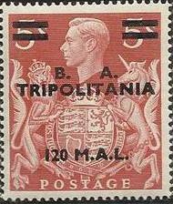 Visibility: public Image owner: none postage 2/5/1950 120l dlred issue=1950 d=King George VI & arms of Britain ovpt=B. A.//TRIPOLITANIA//value oc=blk on=issuer=Great Britain-1939-5sh-dlred wmk=crown & large GVIR Crops No visible images cropped from this one. Measurements Resolution is unknown. Source Source name: Colnect File URL: http://i.colnect.net/b/1692/035/British-Stamp-Overprinted--BA-Tripolitania-.jpg Uploaded September 17, 2014, 10:12 pm by Stan Shebs |