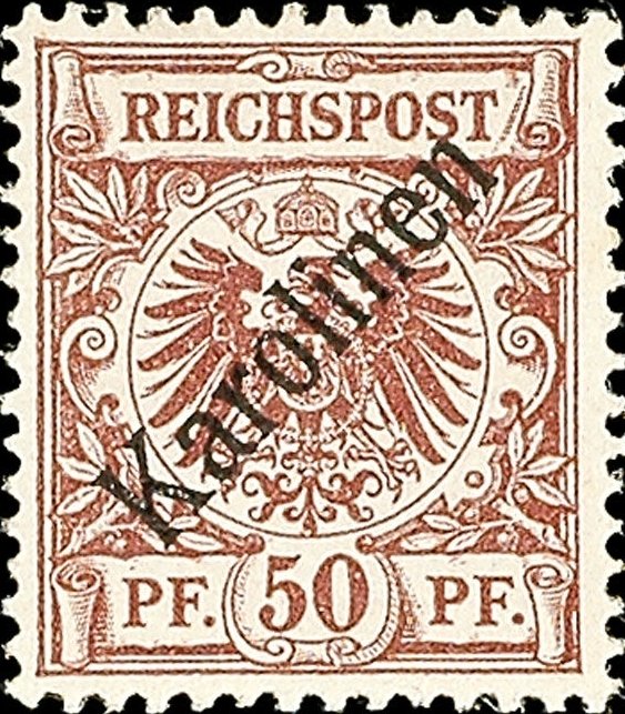 Visibility: public Image owner: none postage 50pf choc issue=1899 d=German eagle (1889) ovpt=Karolinen(48deg) oc=blk on=issuer=Germany-1889-50pf unwmk perf=13.5x14.25 Crops No visible images cropped from this one. Measurements Resolution is unknown. Source Source name: Colnect File URL: http://i.colnect.net/b/1695/063/Crown-eagle-with-overprint.jpg Uploaded September 17, 2014, 10:24 pm by Stan Shebs |