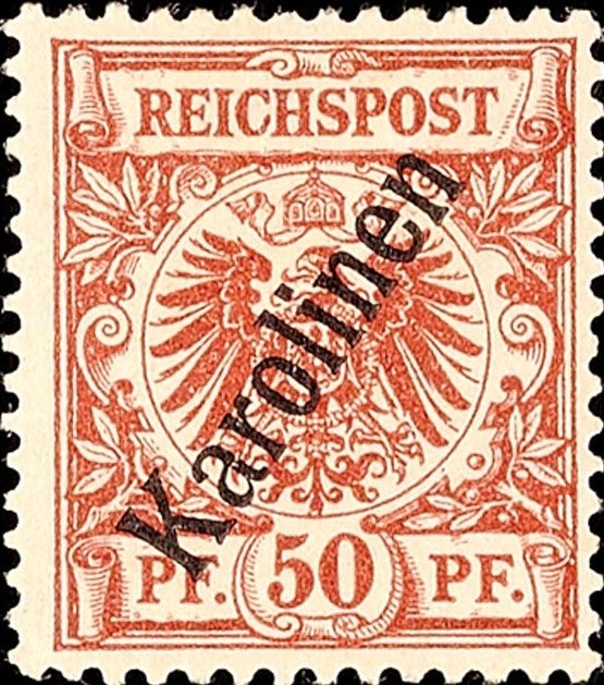 Visibility: public Image owner: none postage 50pf choc issue=1900 d=German eagle (1889) ovpt=Karolinen(56deg) oc=blk on=issuer=Germany-1889-50pf unwmk perf=13.5x14.25 Crops No visible images cropped from this one. Measurements Resolution is unknown. Source Source name: Colnect File URL: http://i.colnect.net/b/1695/064/Crown-eagle-with-overprint.jpg Uploaded September 17, 2014, 10:24 pm by Stan Shebs |