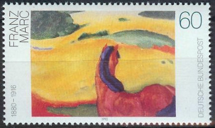 Visibility: public Image owner: none postage 6/11/1992 multi dt=modern paintings (1992) d=Landscape with a Horse, by Franz Marc unwmk perf=13.75x14 Crops No visible images cropped from this one. Measurements Resolution is unknown. Source Source name: Wikimedia Commons File URL: http://upload.wikimedia.org/wikipedia/commons/1/11/DBP_1992_1617-R.JPG Uploaded August 5, 2011, 4:25 am by Stan Shebs |