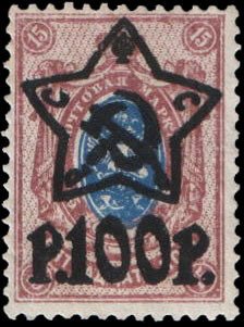 Visibility: public Image owner: none postage 12/1922 100r redbrn&bl issue=1922e d=arms of Russia (1889 mantled) var=varnished oc=blk on=1909-15k unwmk perf=14x14.5 paper=wove Crops No visible images cropped from this one. Measurements Resolution is unknown. Source Source name: Colnect File URL: http://i.colnect.net/b/1069/484/Stars-overprint.jpg Uploaded August 21, 2014, 5:30 pm by Stan Shebs |