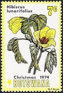 Visibility: public Image owner: none postage 11/4/1974 7c multi issue=Christmas 1974 dt=flowers (1974 Botswana) d=Hibiscus lunarifolius unwmk Crops No visible images cropped from this one. Measurements Resolution is unknown. Source Source name: Colnect File URL: http://i.colnect.net/b/1753/412/Hibiscus-lunarifolius.jpg Uploaded December 4, 2013, 7:17 am by Stan Shebs |