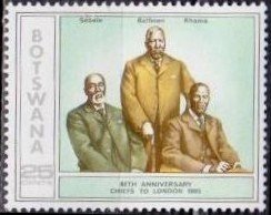Visibility: public Image owner: none postage 10/31/1975 25c multi issue=Establishment of Protectorate, 90th anniv. d=Chief Sebele unwmk Crops No visible images cropped from this one. Measurements Resolution is unknown. Source Source name: Colnect File URL: http://i.colnect.net/b/1753/423/Chiefs-Sebele-Bathoen-and-Khama.jpg Uploaded December 4, 2013, 7:17 am by Stan Shebs |