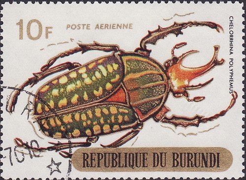 Visibility: public Image owner: none Crops No visible images cropped from this one. Measurements Resolution is unknown. Source Source name: Colnect File URL: http://i.colnect.net/b/1592/348/Giant-African-Fruit-Beetle-Chelorrhina-polyphemus.jpg Uploaded December 4, 2013, 9:28 pm by Stan Shebs |