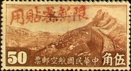 Visibility: public Image owner: none airmail 11/30/1942 50c dkbrn issue=1942 air c unwmk Crops No visible images cropped from this one. Measurements Resolution is unknown. Source Source name: Colnect File URL: http://i.colnect.net/b/1841/124/Airplane-over-Great-Wall-Overprint-in-Red.jpg Uploaded December 5, 2013, 8:01 pm by Stan Shebs |