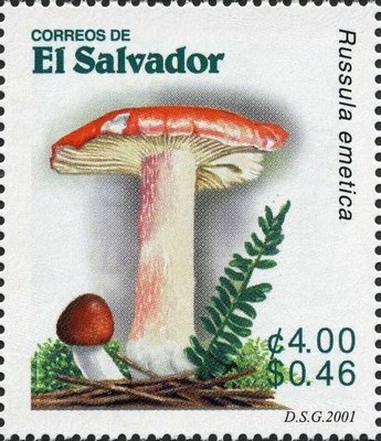 Visibility: public Image owner: none postage 12/20/2001 4col multi issue=Fungi 2001 dt=Fungi (2001 El Salvador) d=Russula emetica (2001) unwmk Crops No visible images cropped from this one. Measurements Resolution is unknown. Source Source name: Colnect File URL: http://i.colnect.net/images/b/1816/267/Russula-emetica.jpg Uploaded December 12, 2013, 5:57 pm by Stan Shebs |