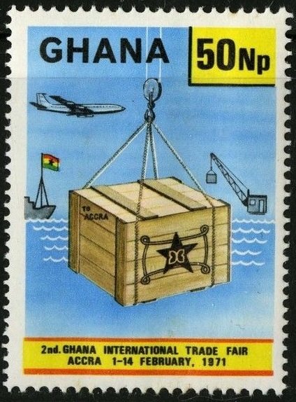 Visibility: public Image owner: none postage 2/5/1971 50np multi issue=2nd Ghana International Trade Fair d=cargo ship & plane wmk=star & G mult Crops No visible images cropped from this one. Measurements Resolution is unknown. Source Source name: Colnect File URL: http://i.colnect.net/images/b/1888/192/Cargo-Ship-and-Plane.jpg Uploaded December 17, 2013, 1:14 am by Stan Shebs |