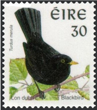Visibility: public Image owner: none postage 2/16/1999 30p multi issue=1999 dt=birds (1997 Ireland) d=Turdus merula (1998) unwmk perf=14x15 Crops No visible images cropped from this one. Measurements Resolution is unknown. Source Source name: Colnect File URL: http://i.colnect.net/images/b/1813/191/Common-Blackbird-Turdus-merula.jpg Uploaded December 22, 2013, 3:59 am by Stan Shebs |