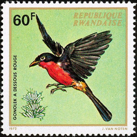 Visibility: public Image owner: none postage 5/17/1972 60fr multi dt=birds of Rwanda (1972) d=Laniarius erythrogaster unwmk Crops No visible images cropped from this one. Measurements Resolution is unknown. Source Source name: Colnect File URL: http://i.colnect.net/b/1780/789/Black-headed-Gonolek-Laniarius-erythrogaster .jpg Uploaded December 27, 2013, 1:30 am by Stan Shebs |