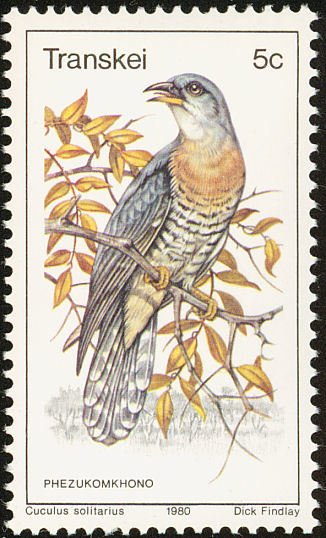 Visibility: public Image owner: none postage 7/30/1980 5c multi dt=birds (1980 Transkei) d=Cuculus solitarius (1980) unwmk Crops No visible images cropped from this one. Measurements Resolution is unknown. Source Source name: Colnect File URL: http://i.colnect.net/b/1456/718/Red-chested-Cuckoo-Cuculus-solitarius.jpg Uploaded December 27, 2013, 2:35 pm by Stan Shebs |