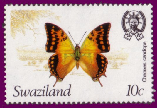 Visibility: public Image owner: none postage 1/6/1982 10c multi dt=butterflies (1982 Swaziland) d=Charaxes candiope (1982) wmk=crown & CA spiral Crops No visible images cropped from this one. Measurements Resolution is unknown. Source Source name: Colnect File URL: http://i.colnect.net/b/1706/372/Green-veined-Emperor-Charaxes-candiope.jpg Uploaded December 28, 2013, 4:08 am by Stan Shebs |