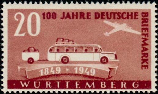 Visibility: public Image owner: none postage 9/17/1949 20pf redbrn issue=German stamp 100th d=post bus with trailer & plane unwmk perf=14 Crops No visible images cropped from this one. Measurements Resolution is unknown. Source Source name: Colnect File URL: http://i.colnect.net/images/b/840/841/100-Years-German-stamps.jpg Uploaded December 28, 2013, 8:54 am by Stan Shebs |