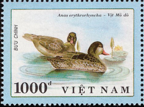 Visibility: public Image owner: none postage 2/15/1990 1000d multi dt=ducks (1990 Vietnam) d=Anas erythrorhyncha (1990) unwmk perf=13 Crops No visible images cropped from this one. Measurements Resolution is unknown. Source Source name: Colnect File URL: http://i.colnect.net/b/1833/964/Red-billed-Teal-Anas-erythrorhyncha.jpg Uploaded December 30, 2013, 10:37 pm by Stan Shebs |