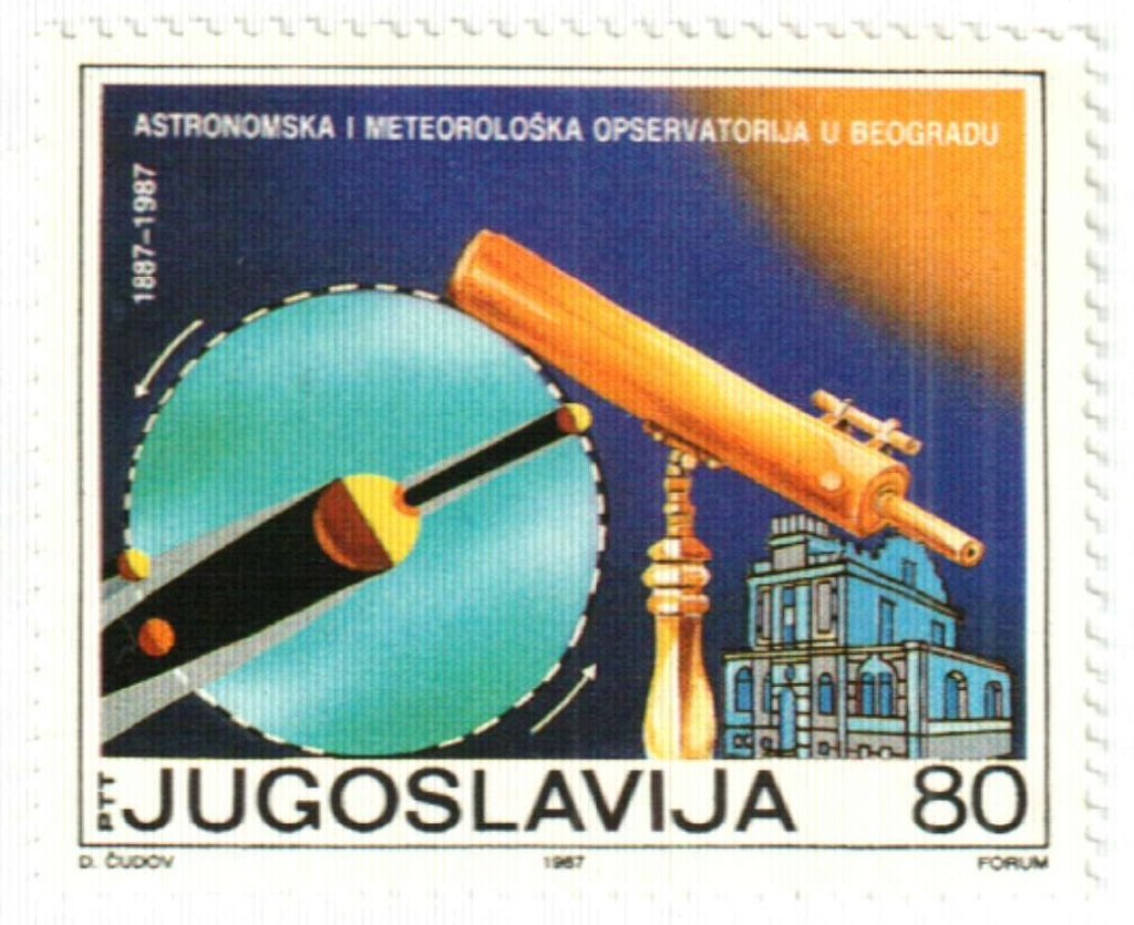 Visibility: public Image owner: none postage 11/21/1987 80din multi issue=100th Anniversary of Astronomical and Meteorological Observatorium, Belgrade unwmk perf=13.75 Crops No visible images cropped from this one. Measurements Resolution is unknown. Source Source name: Colnect File URL: http://i.colnect.net/b/1632/070/Beograd-observatory.jpg Uploaded December 31, 2013, 1:08 am by Stan Shebs |
