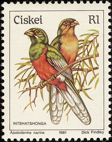 Visibility: public Image owner: none postage 12/4/1981 1r multi issue=birds d=Apaloderma narina (1981) unwmk Crops No visible images cropped from this one. Measurements Resolution is unknown. Source Source name: Colnect File URL: http://i.colnect.net/b/1476/732/Narina-Trogon-Apaloderma-narina.jpg Uploaded January 22, 2014, 6:57 pm by Stan Shebs |